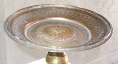 Shallow tray mounted on weighted pedestal, with pierced decorative bands, used for serving betel leaves,