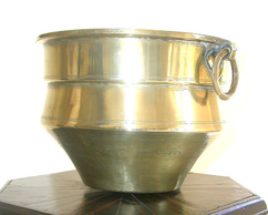 Container with wide mouth, handles riveted on, grooved design, and flat base.