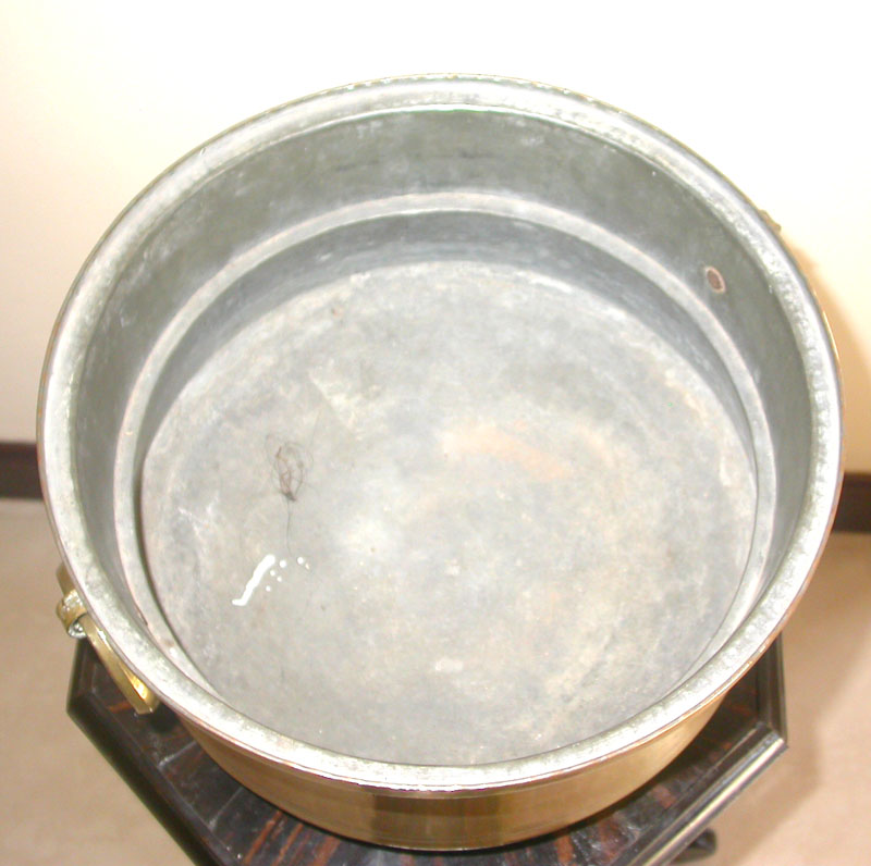 Container with wide mouth, handles riveted on, grooved design, and rounded base.