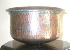 Wide mouth cylindrical pot with rounded base, with hammered rim and side and partially smooth base.