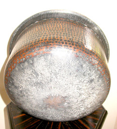 Wide mouth cylindrical pot with rounded base, with hammered rim and side and smooth base.
