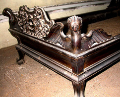 Small bed with carved floral designs and crested parrot with wings spread (possibly Garuda bird), on cane base mounted on claw feet