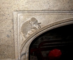 Fireplace mantel of carved wood over a pitted stone face with elephants carved onto each corner, with a wood railing in front