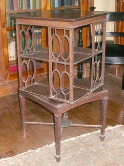 Revolving bookcase, squared area for book son top, supported at the bottom by a table base