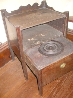 Toilet seat, enclosed in a cabinet, the base pulls open to reveal the porcelain pot with metal lid
