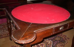 Bridge table with baize covered central area, and large rounded shapes at the four ends to support a glass, small drawer on each side, supported on turned legs