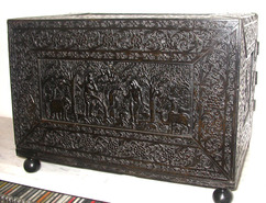 Adam and Eve cabinet, small, intricately carved, ebony exterior with ivory panel interior, two doors, drawers, turned knob feet, wit floral scroll work, with silver attachments