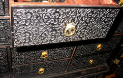 Cabinet on stand, large, intricately carved, ebony exterior and interior, drawers, gold attachments (possibly recent), covered in floral scroll patterns, apron supported on spiral turned legs