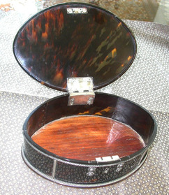 Small oval box with flat hinged lid, with applied silver knobs, escutcheon and hinges