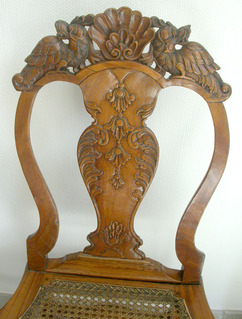 Side chair with affronted mythical birds carved on the high rounded back, single splat with floral carving, caned seat , carved apron, cabriole legs with in animal paw feet, supported by turned stretchers with horizontal cross-bar of carved shell motif