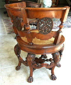 Burgomaster chair, a round chair form with circular high back with three pierced floral pattern oval shapes, caned circular seat, supported by a circular frame, with six turned legs with cross-stretchers, ending in animal paw feet