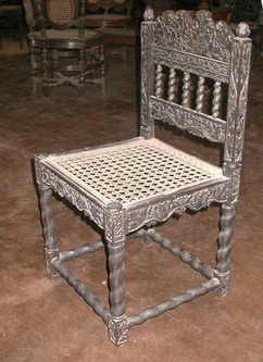Side chair, asymmetrical low relief carving on top rail, turned spindle back rest, cane seat, with turned spiral twisted legs supported by stretchers