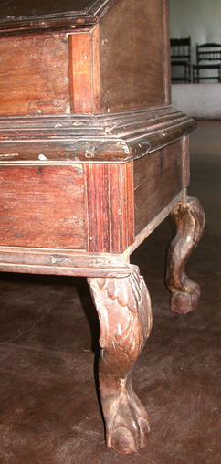 Chest for storage, with hinged sloping lid, brass escutcheon, on a base with two drawers, mounted on cabriole legs and claw and ball feet