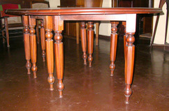 Dining table, in three sections, with two half-round ends and central section, raised on turned and facetted legs.