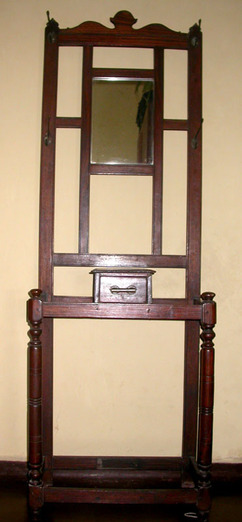 Hall stand, centred by a mirror with carved design on reverse and drawer with brass handles, supported by turned uprights and stretchers. RJ