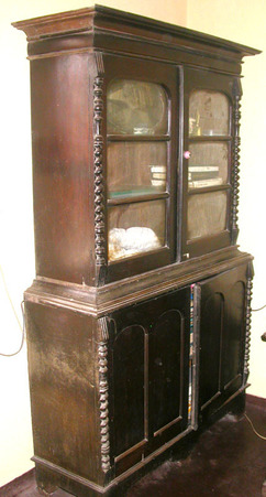 Cupboard in two parts, with cavetto cornice and applied spiral turned half columns, the upper section with glazed doors, the lower section with panelled wooden doors, on bracket feet. RJ