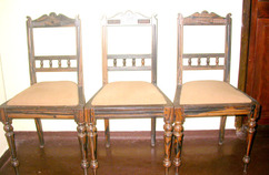 Side or dining chair, with carved and shaped top rail, the cross bar with turned balusters, above an upholstered seat (new), raised on turned tapering legs. RJ