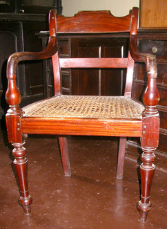 Ceylon pattern armchair with overscrolled uprights, tablet-shaped top rail and curved cross bar, down turned armrests with baluster terminals, cane seat and turned tapering front legs. RJ