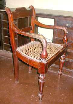 Ceylon pattern armchair with overscrolled uprights, tablet-shaped top rail and curved cross bar, down turned armrests with baluster terminals, cane seat and turned tapering front legs. RJ
