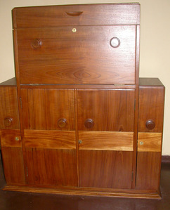 Drinks cabinet, the upper section with fall front and mirrored interior, the lower section with a series of cupboard doors and storage space for glasses. RJ