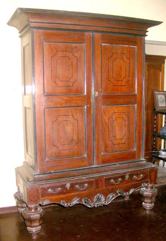 Large cupboard, with cavetto cornice above two ebony inlaid doors, the lower part with two drawers and applied ebony leaf carved decoration, raised on massive turned and facetted legs. RJ