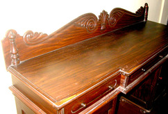 Pedestal sideboard, with shaped and carved splash board, centred with carved shell motif, above three frieze drawers, with pedestal supports containing cupboards, on bun feet. RJ