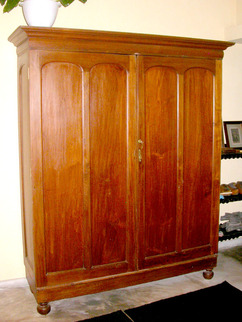 Wardrobe, with two arched panelled doors, raised on small bun feet (the rear feet replaced by blocks). RJ