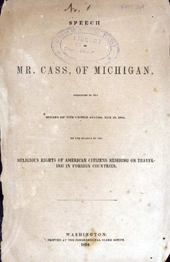 Speech of Mr. Cass of Michigan, delivered in the U.S. Senate, 15 May 1854, concerning the religious rights of American citizens residing or traveling in foreign countries.