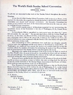Announcement of the World's Sixth Sunday School convention, to be held in Washington D.C., in 1910