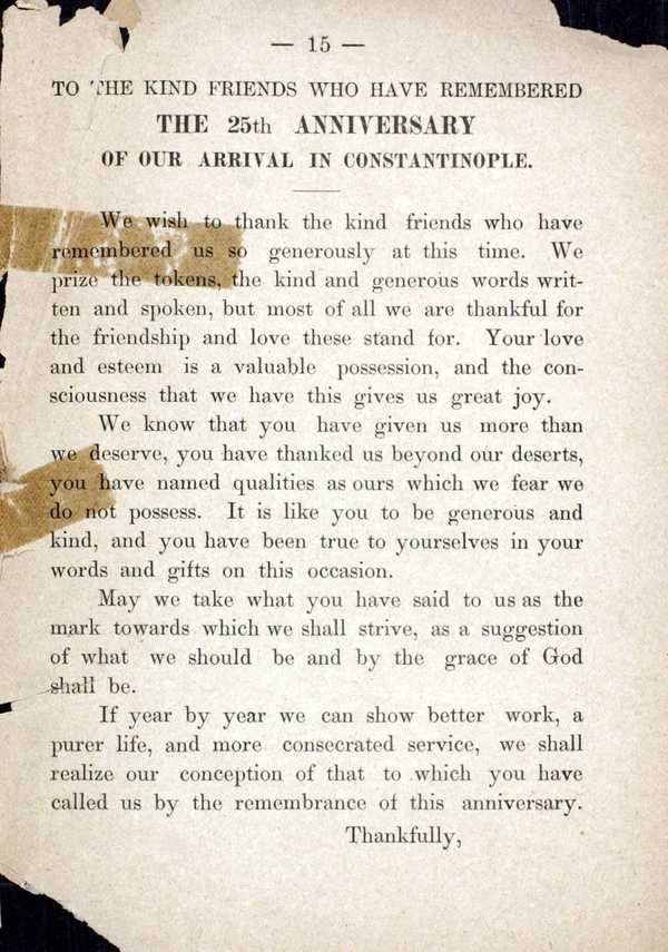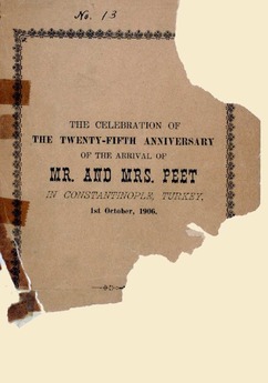 "The celebration of the twenty-fifth anniversary of the arrival of Mr. and Mrs. Peet on Constantinople, Turkey," American Research Institute in Turkey, Istanbul Center Library, online in Digital Library for International Research Archive, Item #11312, http://www.dlir.org/archive/items/show/11312 (accessed April 30, 2026).