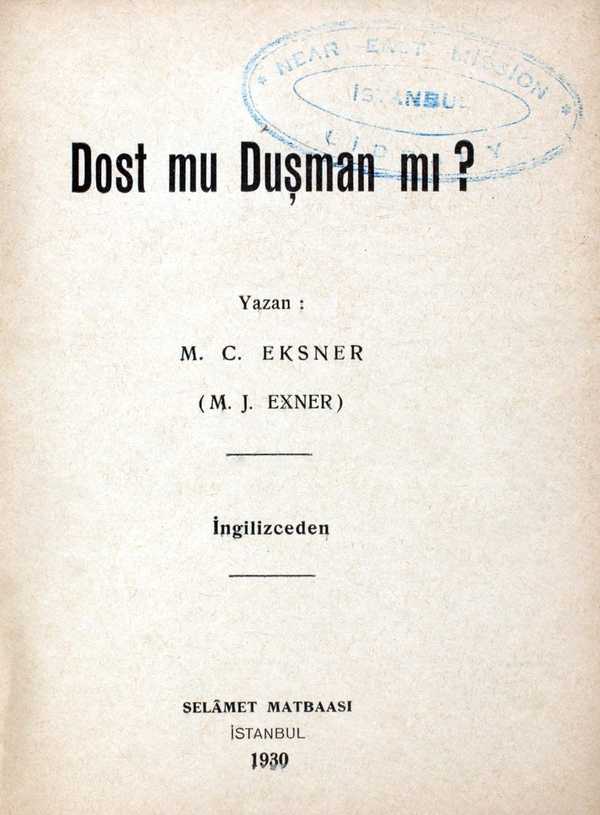 Eksner, M.C. (M.J. Exner), "Dost mu düşman mı?," American Research Institute in Turkey, Istanbul Center Library, online in Digital Library for International Research Archive, Item #11492, http://www.dlir.org/archive/items/show/11492 (accessed April 30, 2026).
