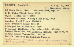 Personnel card and images for Donald K. Abbott, an employee of the American Board