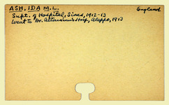 Amerikan Bord Heyeti (American Board), Istanbul, "Personnel records for Ida M. L. Ash," American Research Institute in Turkey, Istanbul Center Library, online in Digital Library for International Research Archive, Item #11572, http://www.dlir.org/archive/items/show/11572 (accessed April 30, 2026).