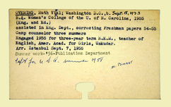 Personnel card for Ruth V. Ovening an employee of the American Board