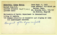 Amerikan Bord Heyeti (American Board), Istanbul, "Personnel records for Susan W. Robertson," American Research Institute in Turkey, Istanbul Center Library, online in Digital Library for International Research Archive, Item #15508, http://www.dlir.org/archive/items/show/15508 (accessed April 30, 2026).