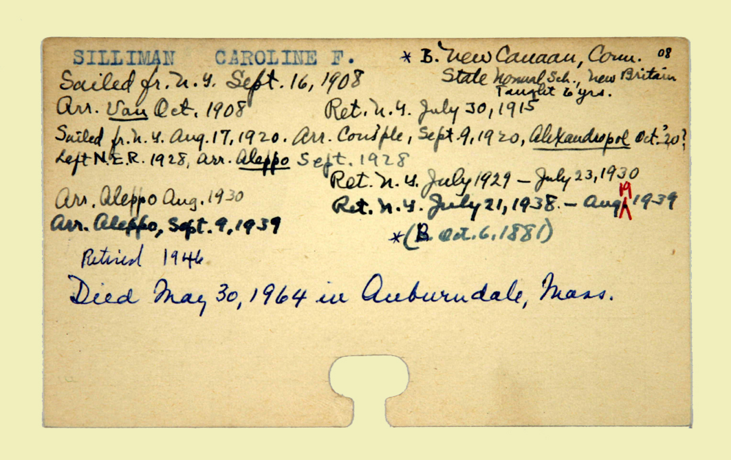 Amerikan Bord Heyeti (American Board), Istanbul, "Personnel records for Caroline F. Silliman," American Research Institute in Turkey, Istanbul Center Library, online in Digital Library for International Research Archive, Item #15594, http://www.dlir.org/archive/items/show/15594 (accessed April 30, 2026).