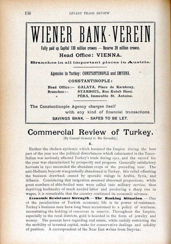 English-language journal published in Istanbul from 1911 to 1931, with reporting on the economy, trade, and financial affairs of Turkey and surrounding areas.