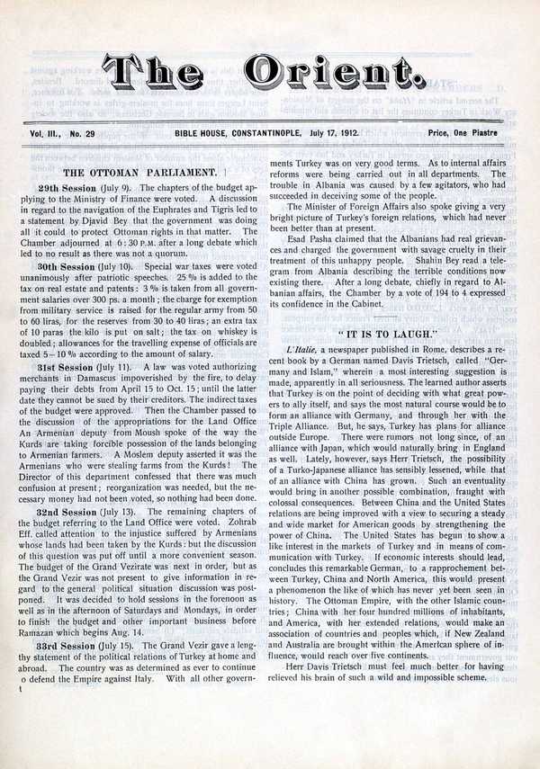 "The Orient: Volume III: Number 29," American Research Institute in Turkey, Istanbul Center Library, online in Digital Library for International Research Archive, Item #11885, http://www.dlir.org/archive/items/show/11885 (accessed April 30, 2026).