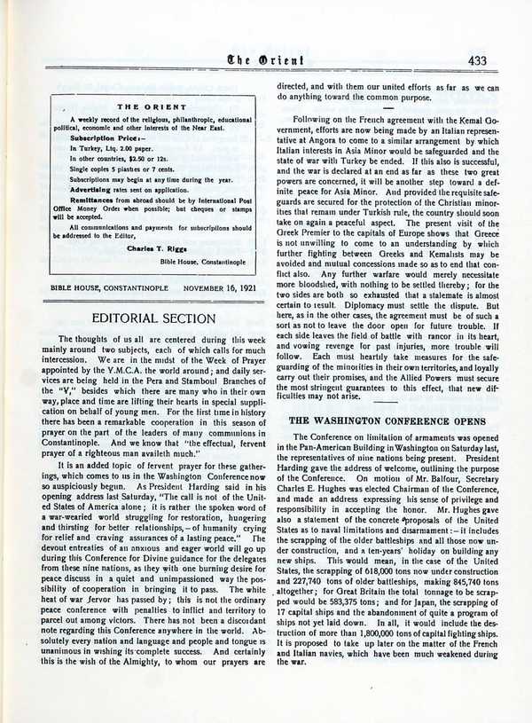 English-language weekly newspaper published in Istanbul from 1910 to 1922, with reporting on contemporary events, politics, and society.