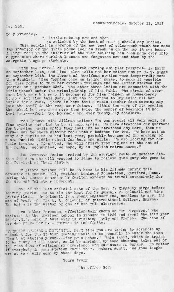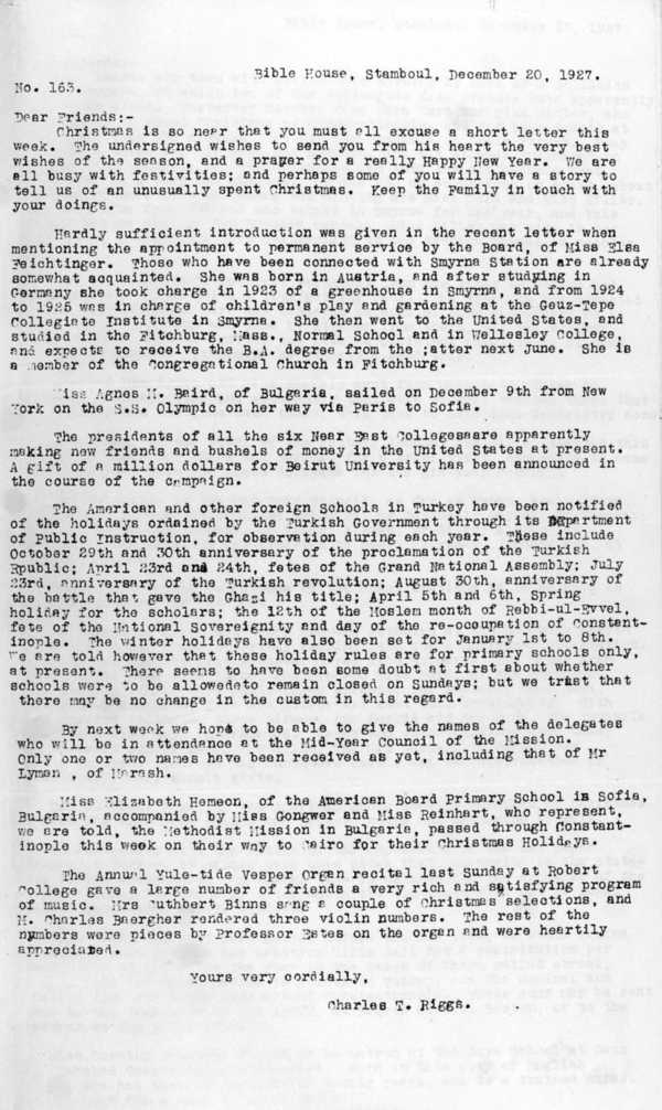 English-language weekly bulletin of the American Board produced in Istanbul from 1924 to c.1990, with notes on current local news and events in the Mission.