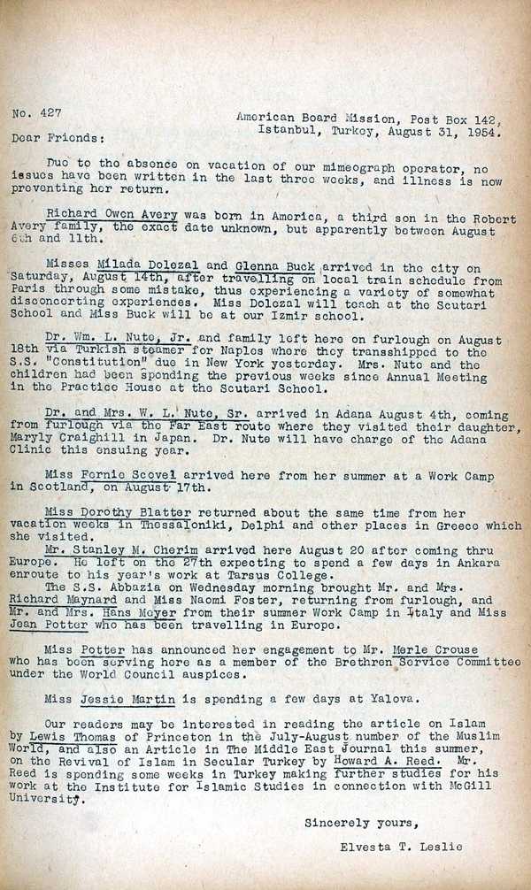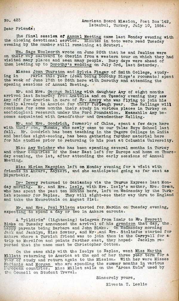 English-language weekly bulletin of the American Board produced in Istanbul from 1924 to c.1990, with notes on current local news and events in the Mission.