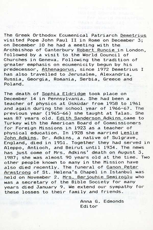 English-language weekly bulletin of the American Board produced in Istanbul from 1924 to 1990, with notes on current local news and events in the Mission.